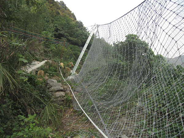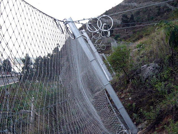 被动边坡防护网:被动防护系统是由钢丝绳网,钢丝格删网.锚杆,工字钢柱,上下拉锚绳,减压环,底座及上下支撑绳等部件构成.系统由钢柱和钢绳网联结组合构成一个整体,对所防护的区域形成面防护,从而阻止崩塌岩石土体的下坠,起到边坡防护的作用. SNS被动防护系统的特点在于:系统的柔韧性和栏截强度足以分散传递预计的落石冲计冲击动能,减压环的设计和采用使系统的抗冲击能力得到进一步提高.与钢性拦截与砌浆挡墙相比:该变了原有施工工艺,使工期和资金得到减少.
